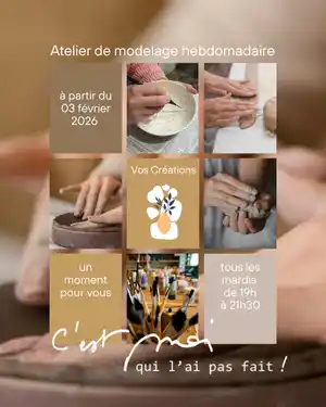 A partir du mardi 03 février 2026, je vous propose un atelier de modelage hebdomadaire : tous les mardis de 19h à 21h30 env. à l'atelier de l'Usine Bellevue à Charmes sur Rhône, même durant les vacances scolaires.