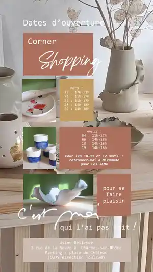 Le corner shopping ouvre ses portes de manière ponctuelle : en après-midi ou en soirée... si vous ne trouvez pas un créneau qui vous convienne : contactez-moi en mp sur Instagram ou par mail pour que nous trouvions un rendez-vous !